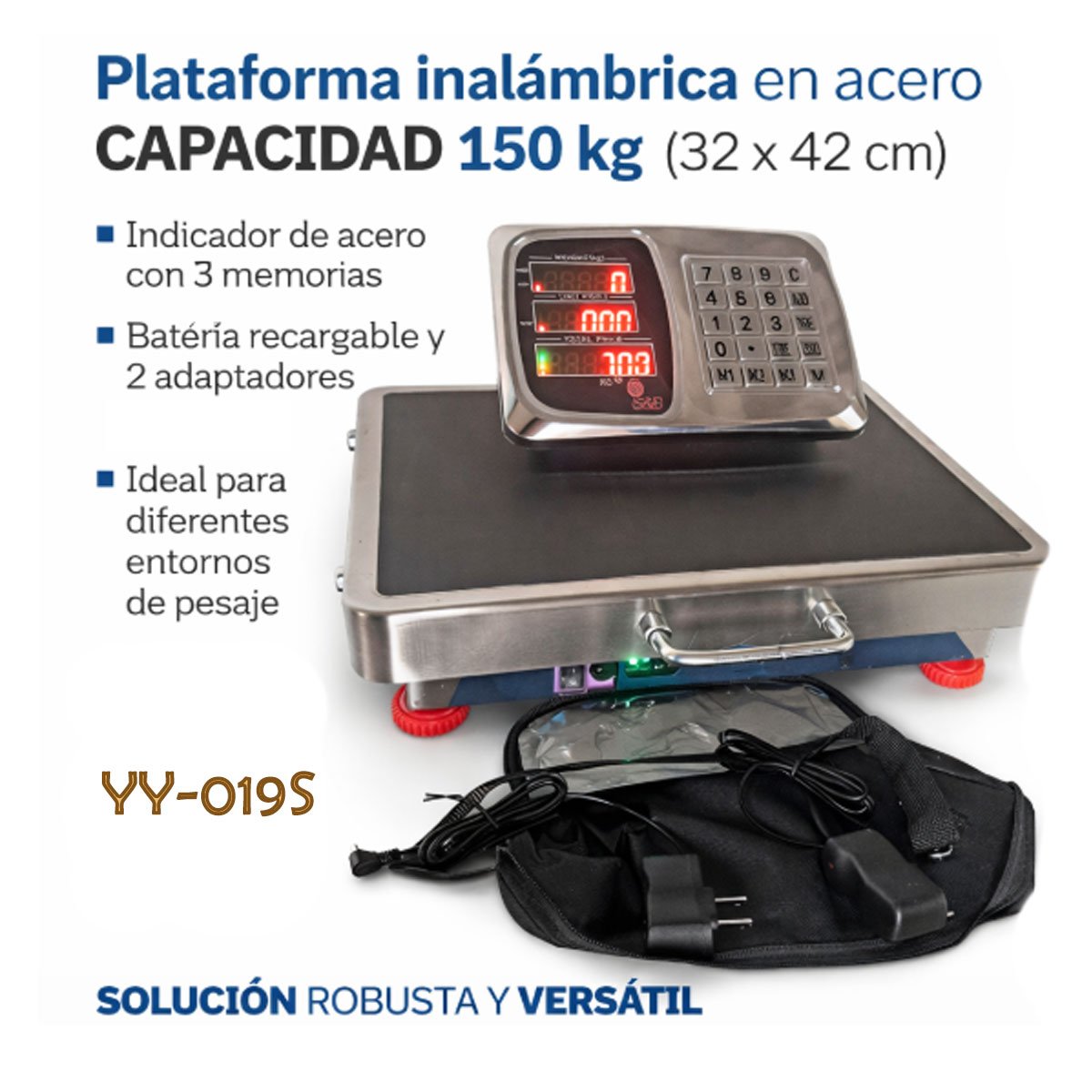Plataforma WIFI, equipadas con un indicador de acero que cuenta con 3 memorias, estas plataformas también incluyen batería recargable y 2 adaptadores, brindando una solución robusta y versátil para diversos entornos de pesaje. Recepcion de productos alimenticios en mercados menores, restaurantes e industrias con manejo de materias primas.