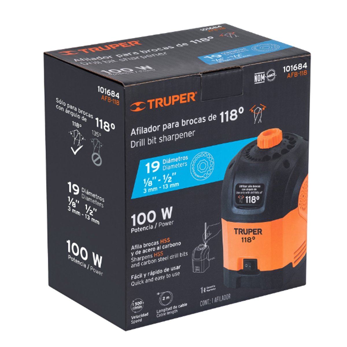 Diámetros de afilado para brocas con punta 118° 1/8″, 9/64″, 5/32″, 11/64″, 3/16″, 13/64″, 7/32″, 15/64″, 1/4″, 17/64″, 9/32″, 19/64″, 5/16″, 21/64″, 11/32″, 23/64″, 3/8″, 7/16″ y 1/2″