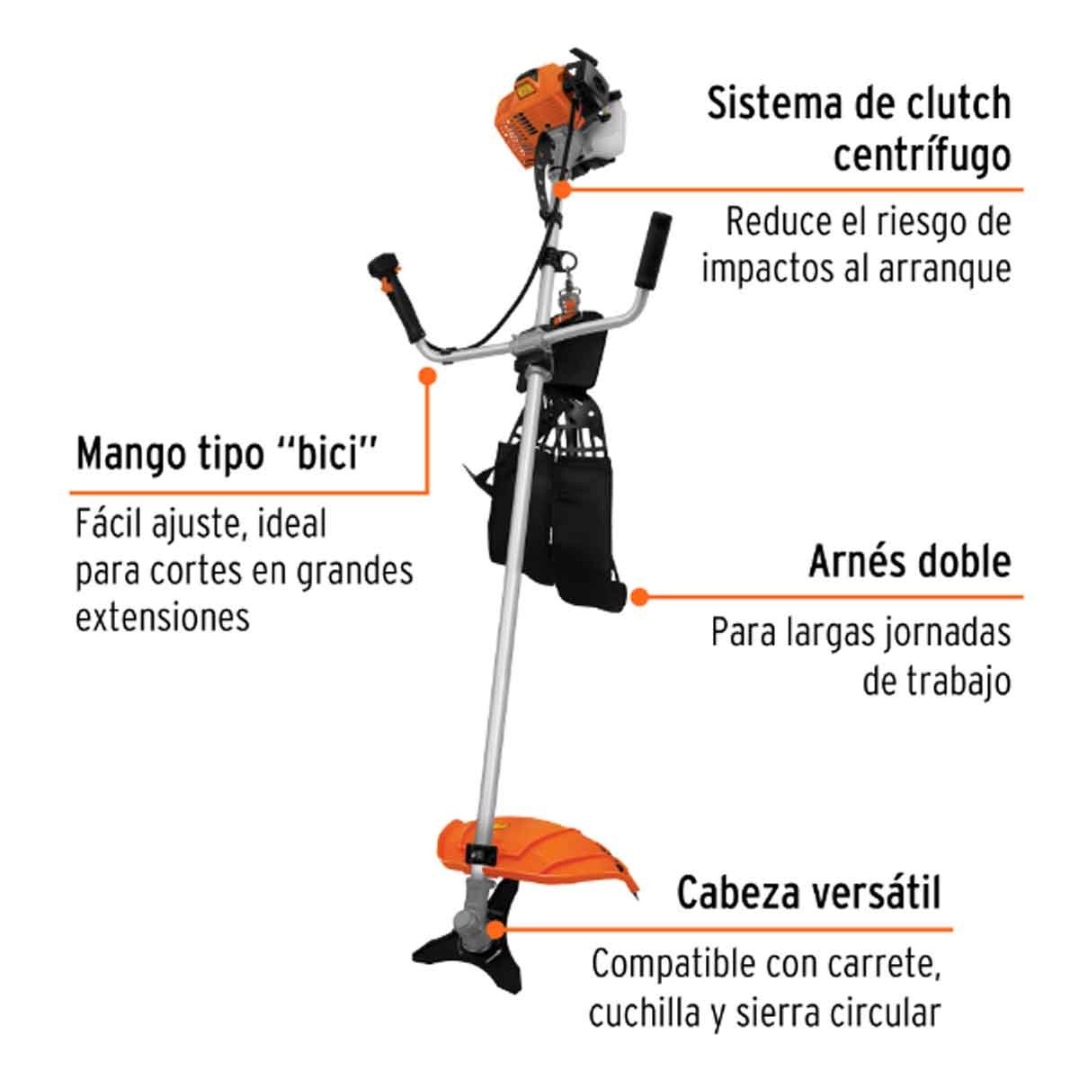 Arnés robusto y manubrio con doble agarre para uso continuo