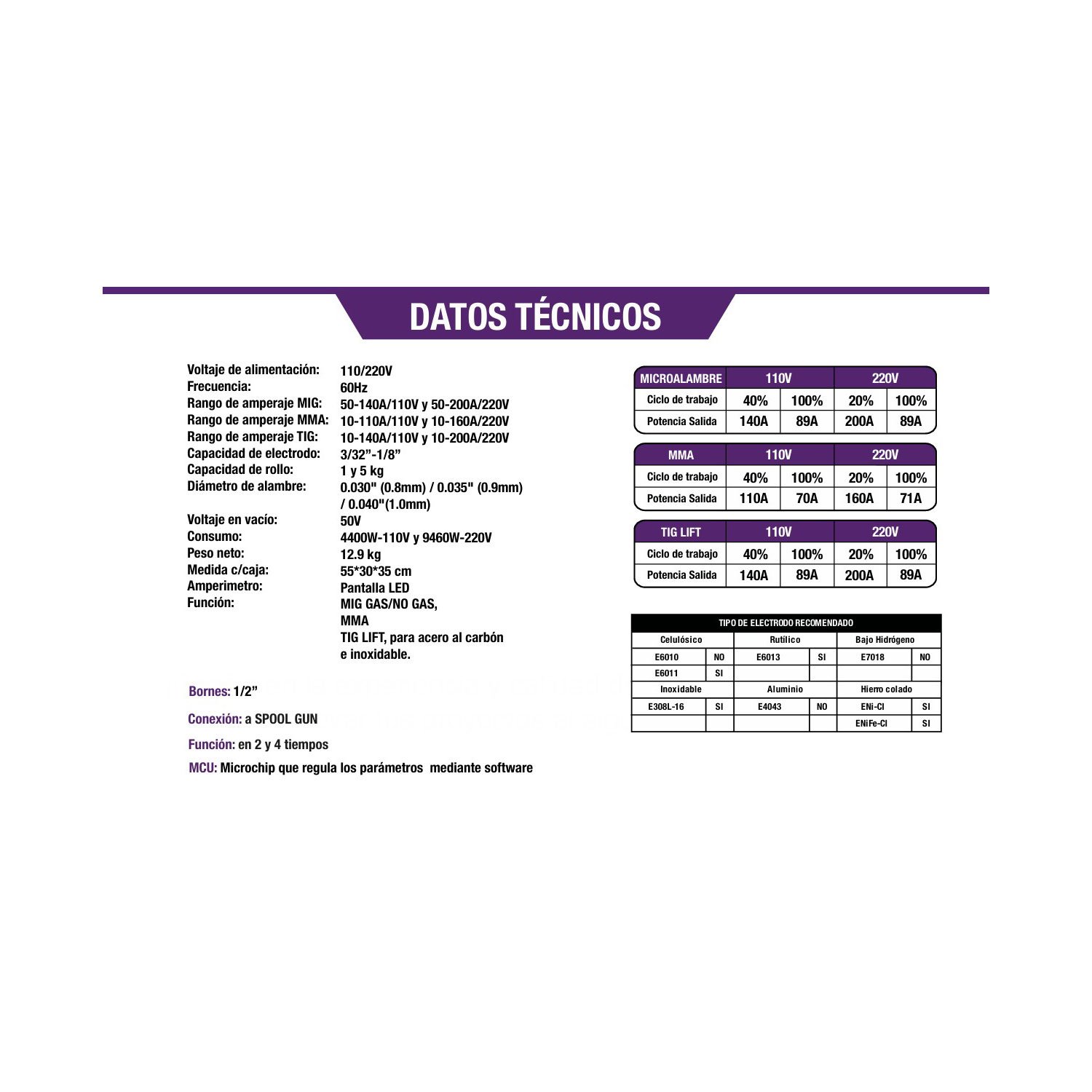 Rango de amperaje MIG: 50-140A/110V y 50-200A/220V