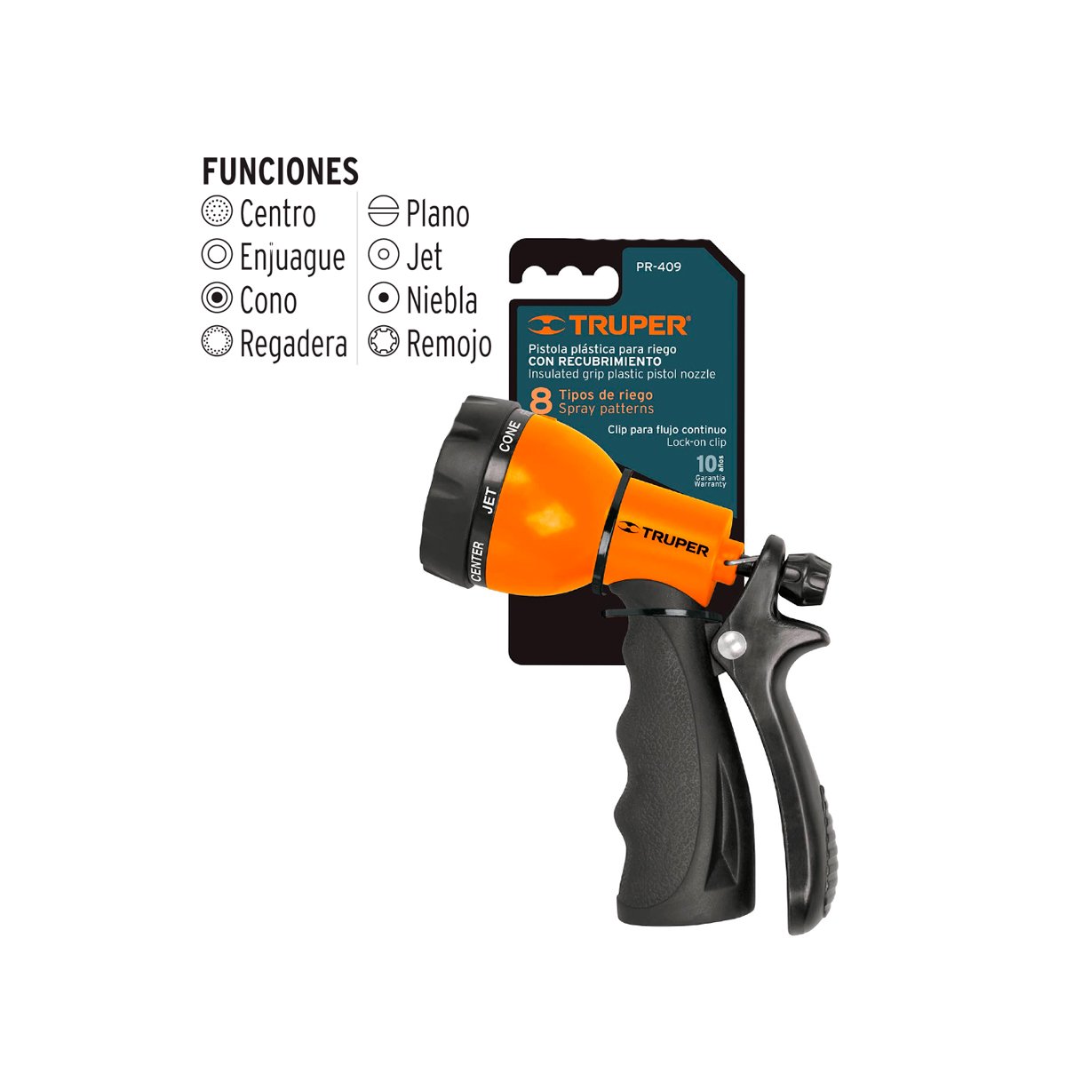 Cuerpo fabricado de plástico ABS y TPR Clip para flujo continuo 8 Funciones, centro, enjuague, cono, regadera, plano, jet, niebla, remojo